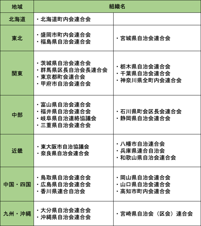 本会は、昭和47年4月に「全国町内会自治会連合会」として設立され、昭和49年に「全国自治会組織連合会」に改称後、一時期活動を休止しておりましたが、昭和60年に「全国自治会連合会」として再発足し、現在に至っております。