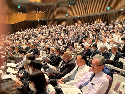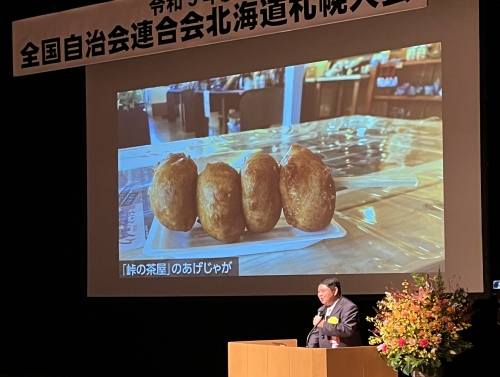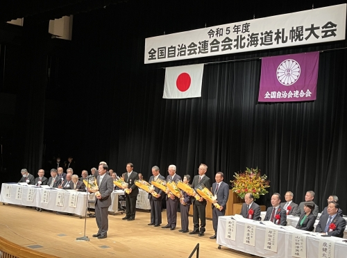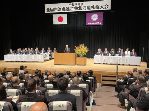 令和5年10月18日、全国自治会連合会の全国大会が北海道札幌市で開催されました。大会会場の「かでる2.7」には、全国から約500名の関係者が出席。長谷川敬二会長(北海道町内会連合会・根室市)は主催者を代表し、自治会・町内会活動は、私たちの最も身近な存在。全国各地で開催する本大会も今年で36回目を迎える。大会継続により、本会活動が多くの皆さまにより広く理解されることを確信すると挨拶。また、本大会は初めてオンラインでライブ配信されました。