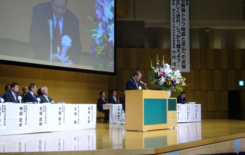 岩崎正朔会長(香川県連合自治会)は主催者を代表し、近年頻発している地震や豪雨などの大規模な災害時に、自治会など住民組織の役割をあらためて認識する重要性について触れました。そして、行政機関等との連携のもと、住民同士の絆を深めながら、協力して地域の暮らしを守る活動に取り組んでいくことが重要であり、今後の地域課題の解決のために、本大会が実り多いものになることを願いたいと挨拶しました。