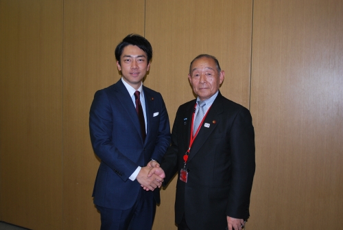 表彰式後、小泉進次郎衆議院議員とお会いする機会があったことから、全国自治会連合会の活動について説明し協力を依頼しました。