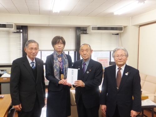 2月21日に岡山県庁を鈴木会長、久世常任理事及び目黒相談役が訪問し、中谷保健福祉部長に対して平成30年7月豪雨被災者支援のための義援金をお渡ししました。